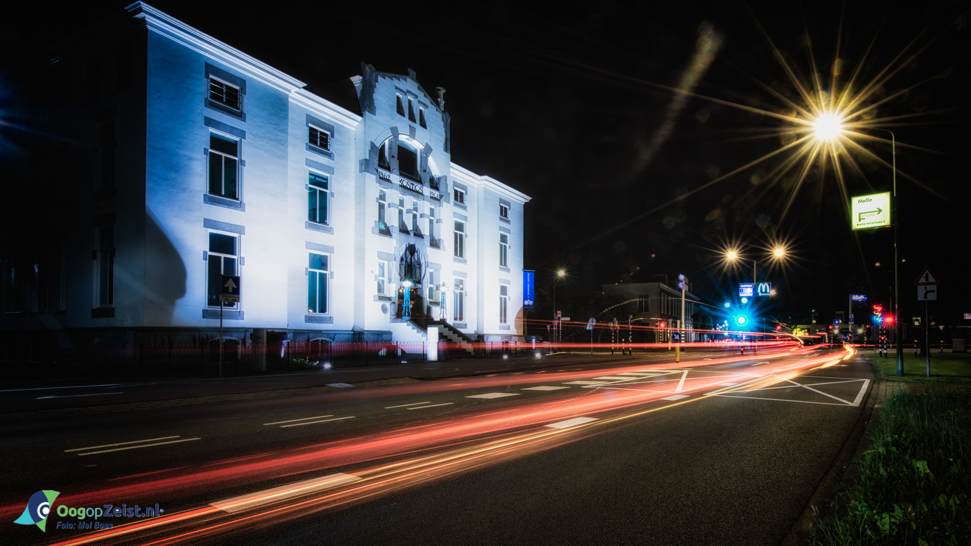 Nachtopname van gebouw de Kosmos aan de driebergseweg.
