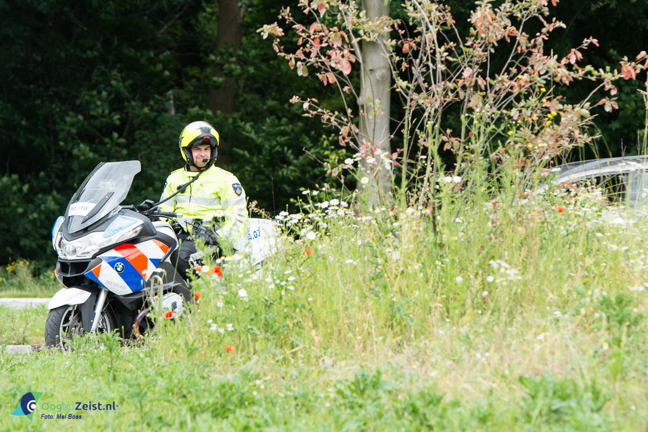 Verstopt achter de boom op de rotonde van de Dreef stond deze agent het verkeer in de gaten te houden.