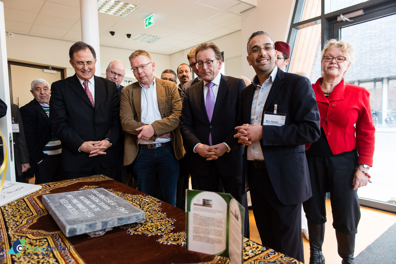 De rondleiding startten met het bewonderen van de gedenksteen voor de bouw van deze nieuwe moskee. Lang werd er gesproken met de dames, die verantwoordelijk zijn voor het lesprogramma voor de kinderen. Burgemeester Koos Janssen en zijn vrouw kregen uitleg, hoe de dames de heren toch een beetje in de gaten konden houden beneden.