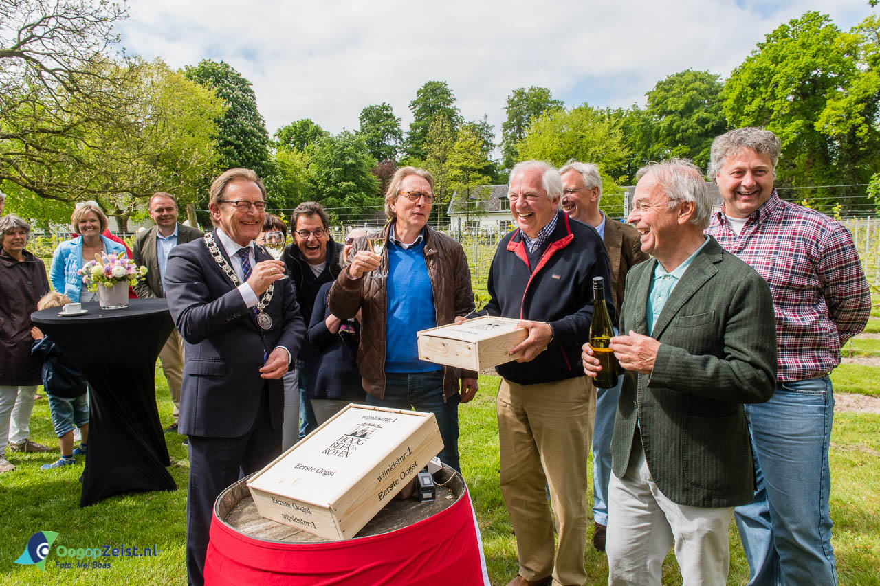 Zeist – vrijdag 15 mei 2015 burgemeester van Zeist Koos Janssen neemt de eerste doos wijn van Zeister Bodem in ontvangst. Deze eerste oogst van uit de wijngaard van het Landgoed Beek en Royen is tot stand gekomen door een een initiatief van de Rotary Club Zeist in samenwerking met het Utrechts Landschap. De eerste kist wijn met 2 flessen en 2 gegrafeerde glazen zal worden geveild. De eerste bieding werd ontvangen van de gebroeders Ruys van Hotel Figi. De netto opbrengst van de eerste oogst is in totaal 770 flessen witte wijn. Zal worden besteed aan goedde doelen in de omgeving van Zeist. De wijn met een smaak naar groene appeltjes is goed te drinken en bijna op dronk.