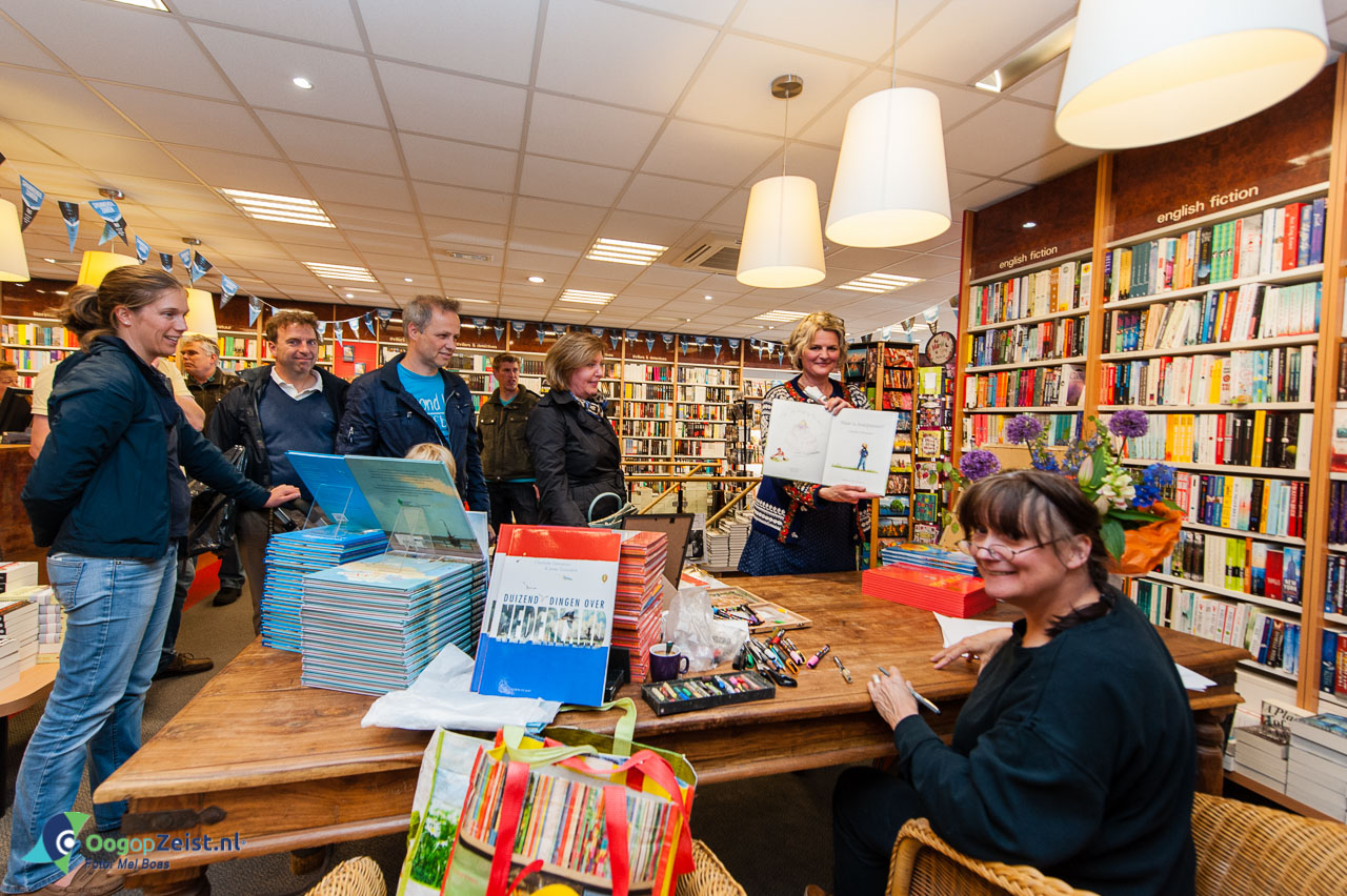 Zaterdag 30 mei was er bij Boekhandel Kramer en van Doorn een klein feestje in de winkel. De illustratrice Charlotte Dematons kwam op bezoek om boeken om een zeer bijzondere manier te signeren! De illustratrice van onder andere “Nederland”, “De gele ballon” en het beroemde “Sinterklaas”boek maakte onlangs het schitterende “Holland op z’n mooist” en illustreerde “Nooit denk ik aan niets”. Als Charlotte een boek signeert zet ze natuurlijk niet alleen een handtekening. Ieder boek werd voorzien van een persoonlijke illustratie. Dat kost natuurlijk even tijd. Tijdens het tekenen ging Charlotte uitgebreid in gesprek met de wachtende in de rij.