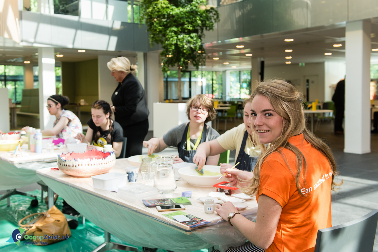 Op vrijdagmorgen 5 juni werd de expositie afgesloten met een open ateliertafel in de bankhal. Kunstzinnige meiden van Abrona namen aan de tafel plaats om ter plekke keramiek te beschilderen. Medewerkers van de bank konden aanschuiven en hun creativiteit even de vrije loop laten.