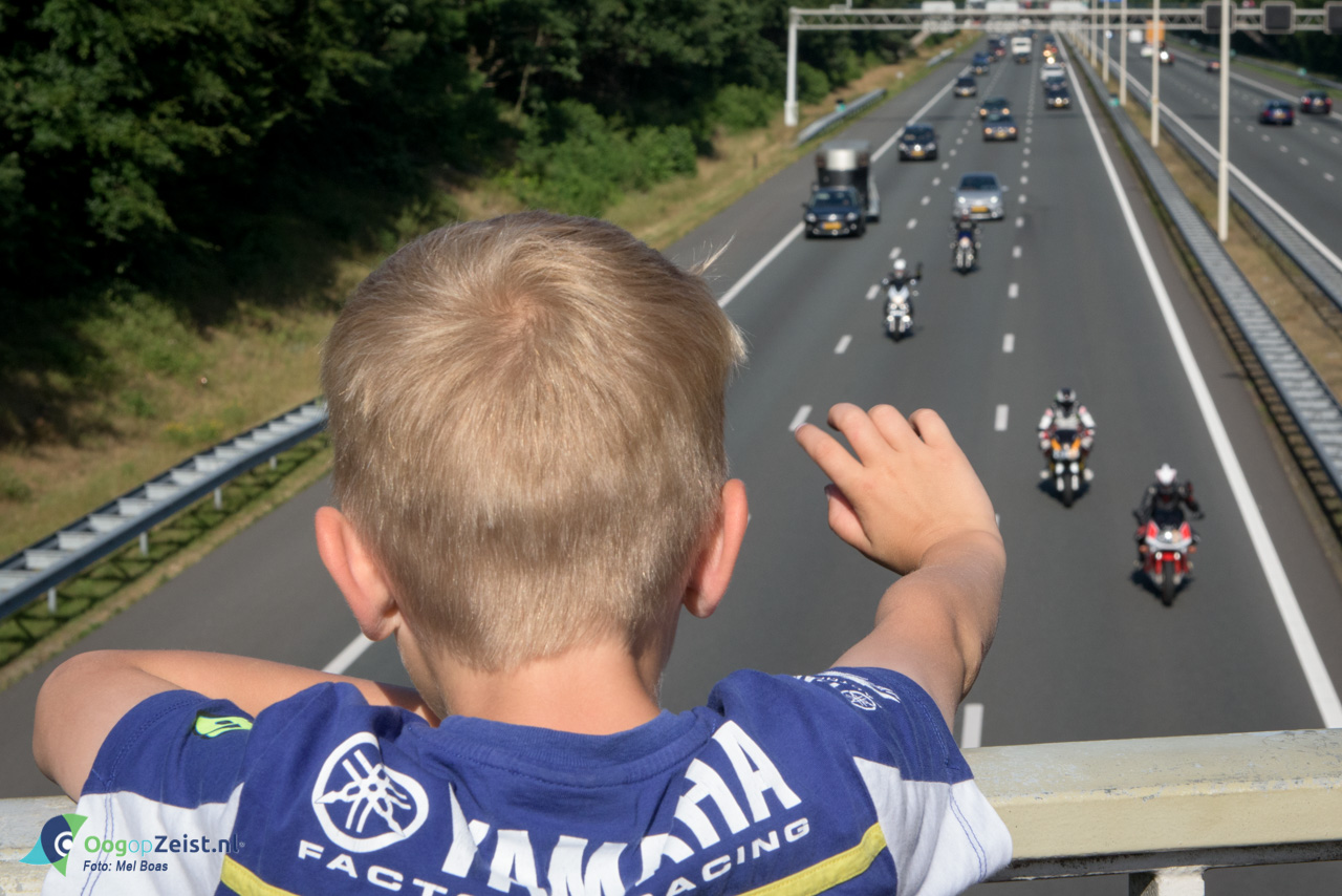 De motorrijders groeten de kijkers terug door even extra het gas op te trekken als ze onder de brug doorkomen.