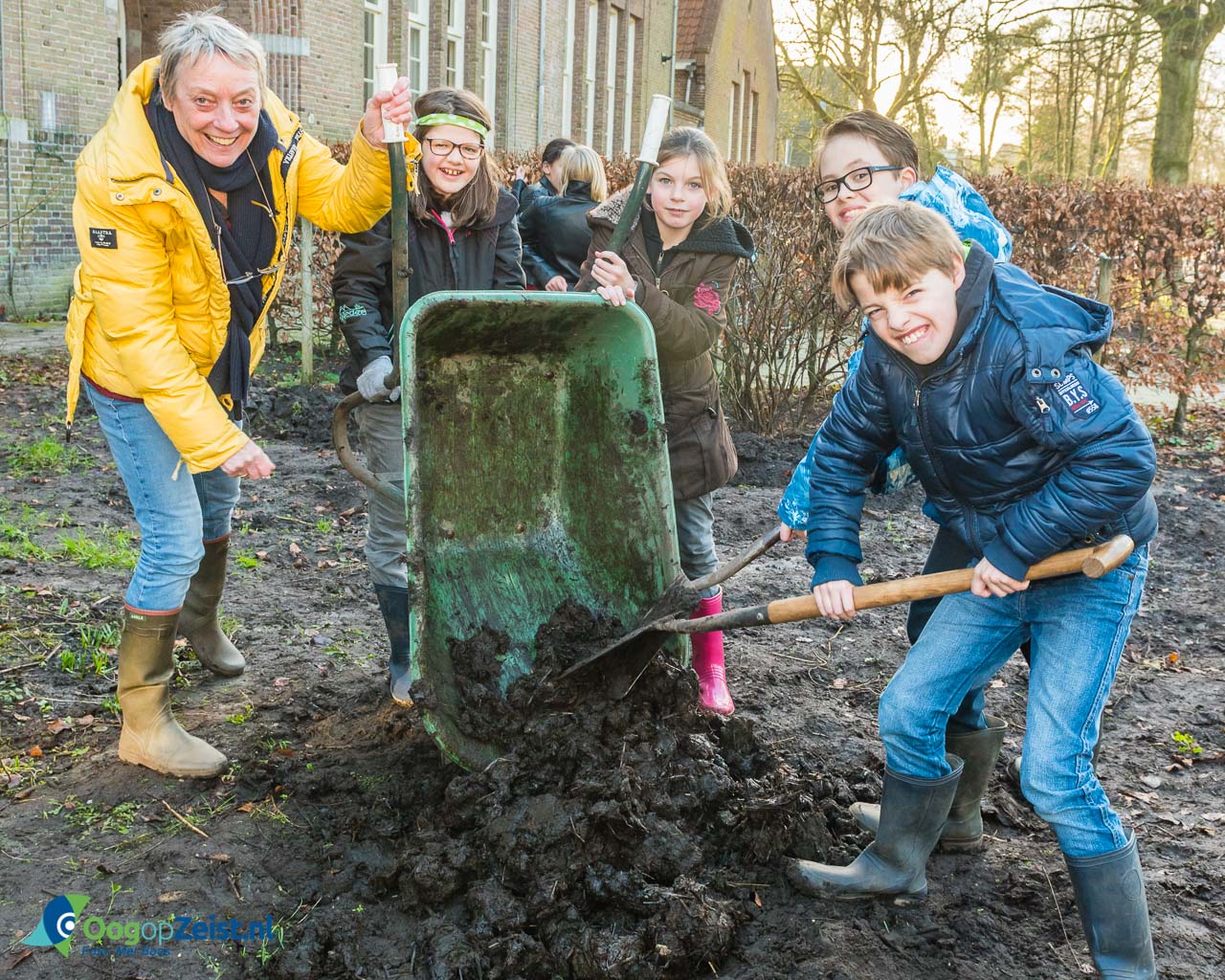 De leerlingen van groep 7 van de Tobiasschool aan de Lorenzlaan zijn vrijdagmiddag lekker aan het tuinieren onderleiding van meester Martin en klassenjuf Leen. Een uurlang lekker tuinieren is een verademing na de eerste week school in het nieuwe jaar. Vol met uren van taal en rekenen in de klas. Groep 7 kan zich helemaal uitleven met spitten en bemesten van de tuin.