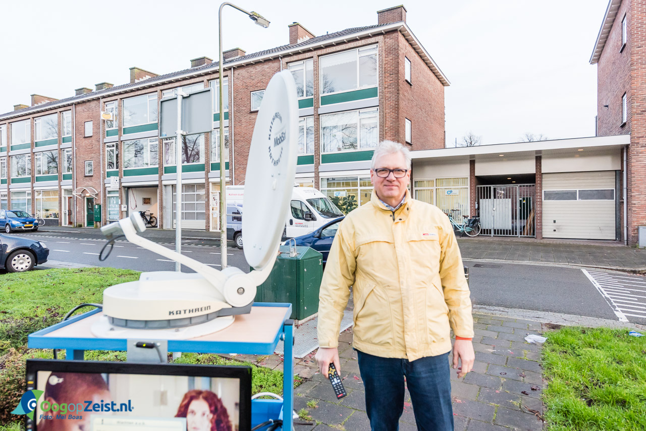 Ed Bruissaard van Hutronic is druk met het testen van deze omgebouwde satelliet ontvanger op de van Oldenbarneveltlaan. Regelmatig verlaat productmanager Ed Bruisaard de werkplaats bij Hutronic om zijn schotels te testen met vrij uitzicht op de hemel, waar alle omroepsatellieten hangen.. Ed heeft zojuist de schotel van dit automatische satelliet systeem vervangen. Nu controleert hij alle satellieten nog steeds goed gevonden kunnen worden.