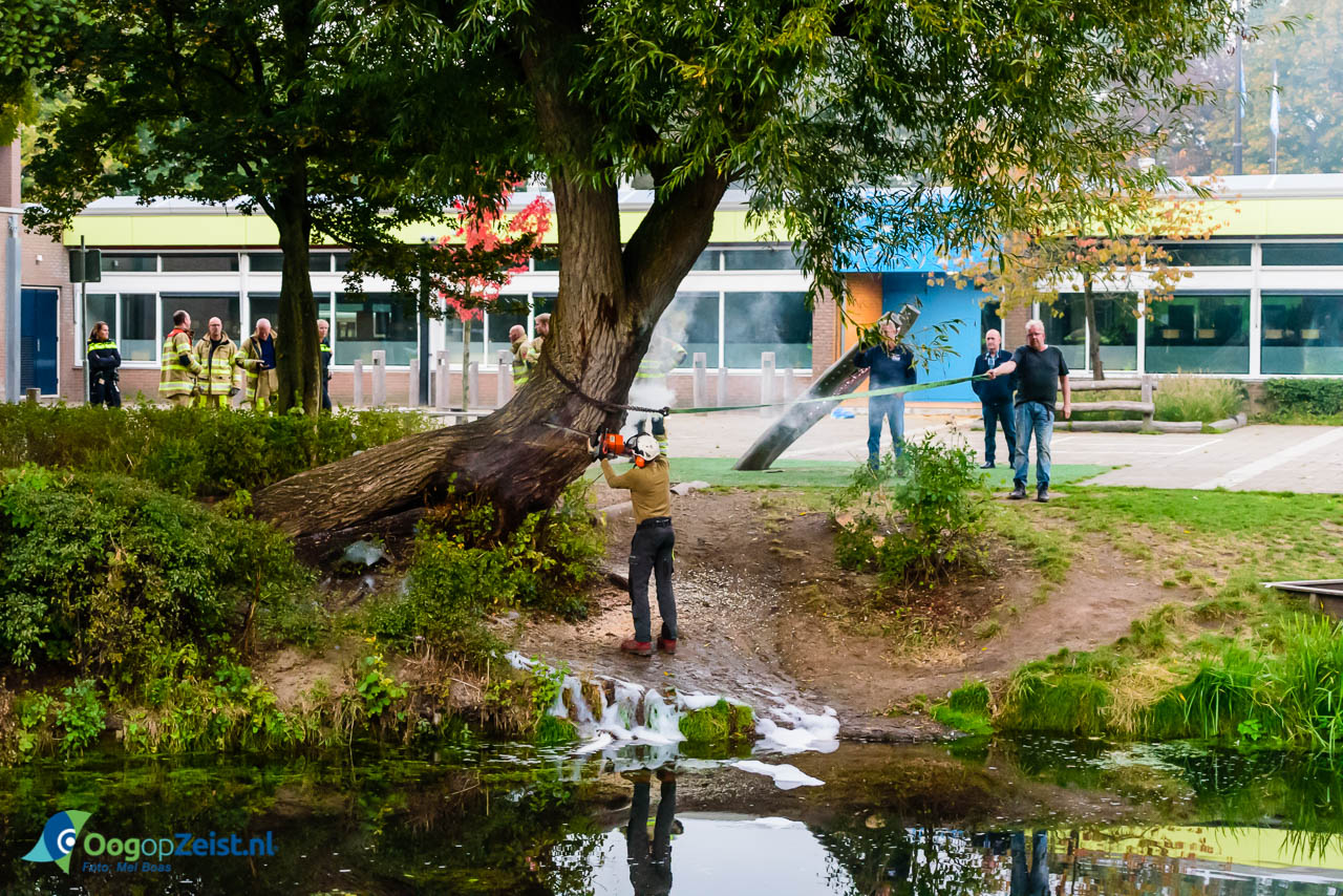 De brandweer is vandaag tweemaal ter plaatse geweest om de brand in de Lindenboom voor het schoolplein van Basisschool de Sluis te blussen. Vandalen hadden maandagmiddag een fikkie gestookt in de holtes van de 40 jaar oude lindeboom. Het blussen van het smeulende vuurtje in de boom bleek erg lastig te zijn. ’s Middags had brandweer de brand in de holtes van de boom al met schuim proberen te blussen. Toen de boom weer stond te roken besloot de brandweer bij de tweede melding om de boom direct te kappen en weg te laten halen. Dit gebeurde in overleg met de gemeente, die een gespecialiseerd hoveniersbedrijf liet komen om deze werkzaamheden uit te voeren. De boom is meteen afgevoerd.. De net aangelegde visvlonder naast de boom is gelukkig gespaard gebleven. De brand is waarschijnlijk aangestoken door schooljeugd die zich tijdens de herfstvakantie aan het vervelen was. Het schoolplein, de parkeerplaats voor de school en de overdekte fietsenstalling is een veel gebruikte hangplek voor jongeren uit de buurt.