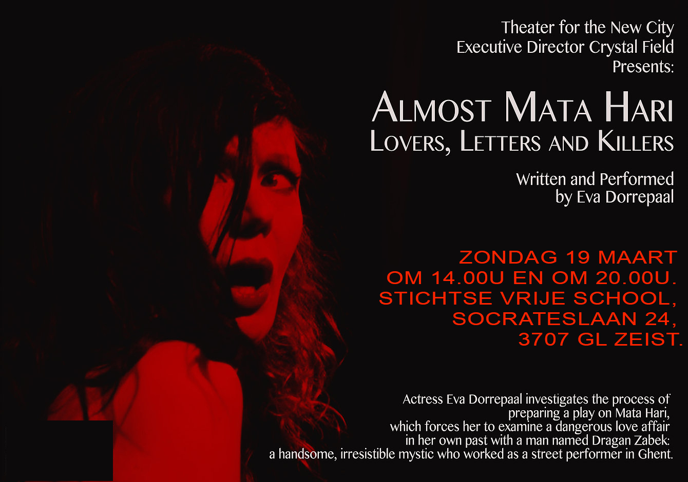 Zondagmiddag en zondagavond kunt u naar een bijzondere gevaarlijke voorstelling in de Stichtse Vrije School “Almost Mata Hari – Lovers, Letters en Killers” is een one-woman-show uit New York die gebaseerd is op twee waargebeurde verhalen. Het gaat over de aantrekkingskracht van gevaarlijke liefdes. Deze one-woman-show wordt in Zeist geregisseerd door drama docent Myrthe Amons.