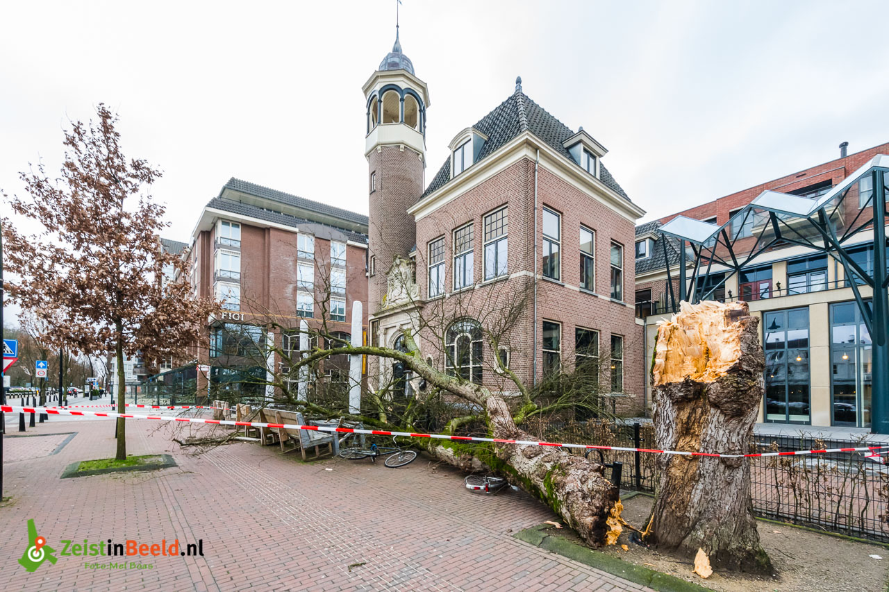 Stormschade aan het Rond. De eik voor het oude postkantoor heeft deze storm niet kunnen weerstaan in Zeist. De boom is omgewaaid. De boom is boven op het terras van Grand Café de Posterij beland. Het postkantoor is niet beschadigd.