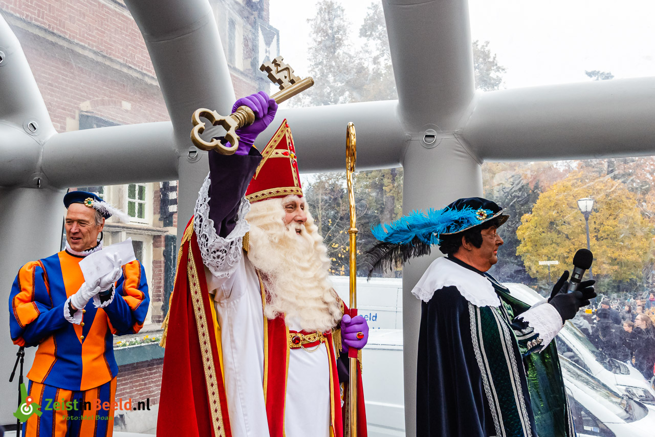 Intocht van Sinterklaas in Zeist. Sinterklaas heeft de komende weken zijn intrek genomen in Slot Zeist. Voor het gemeentehuis ontving de goedheiligman de sleutel van het Slot uit handen van burgemeester Koos Janssen. Waarna hij op zijn paard met zijn gevolg door het centrum van Zeist trok. Voor alle kinderen waren er pepenoten en ander lekkers. Van de Sint mogen alle kinderen de komende weken hun schoen zetten.