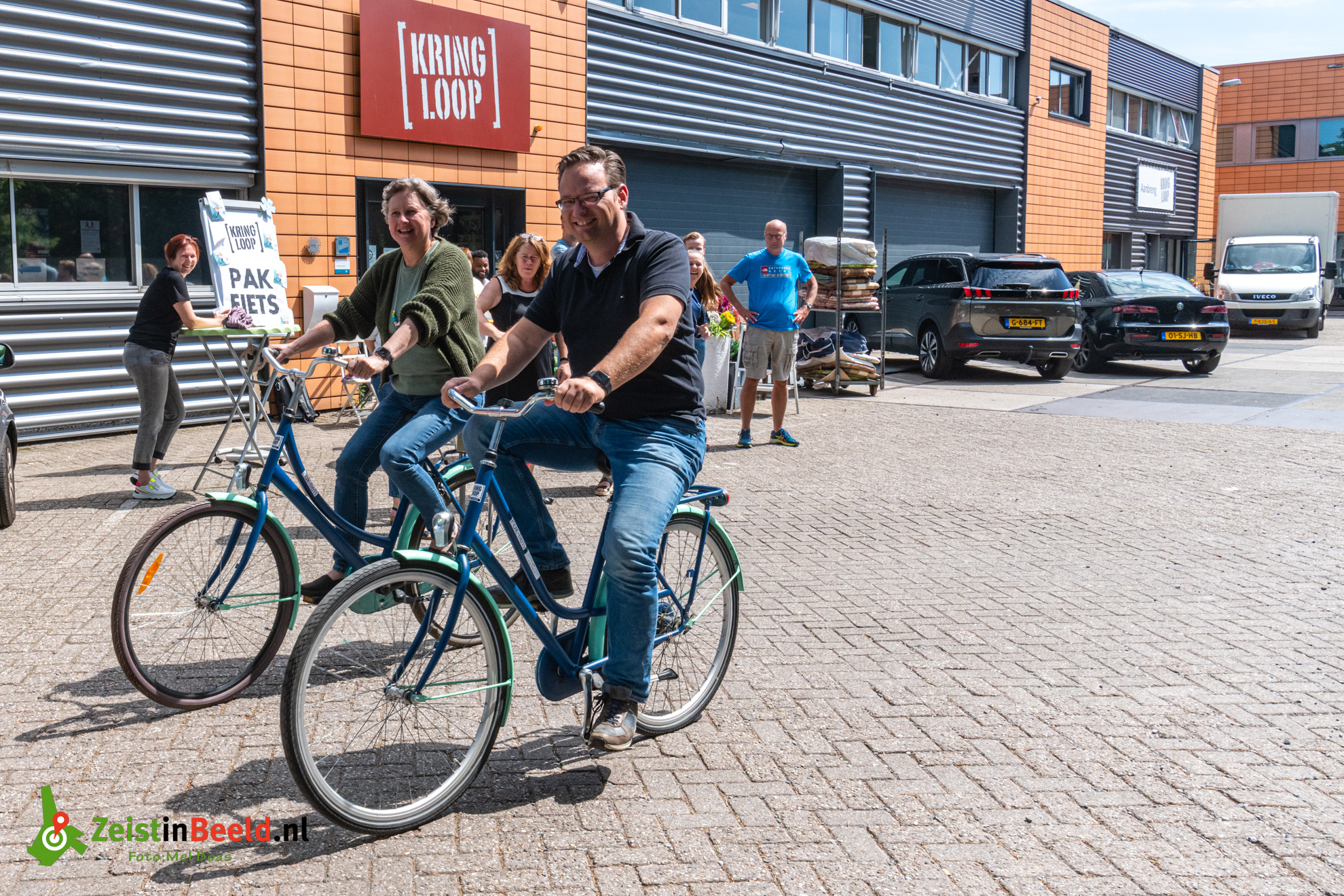 Daar gaan Menno van Drunen van Supply Value en Ingrid Wong van Samen voor Zeist op de eerste Pakfietsen. Ze kregen deze eerste leasefietsen van de Kringloop namelijk een jaar gratis op proef. De fietsen zijn door de Kringloop opgeknapt en worden door de Kringloop onderhouden en waar nodig gerepareerd. De leasende bedrijven bieden hiermee hun medewerkers een fiets om naar afspraken in de buurt te gaan of even een boodschap te doen.